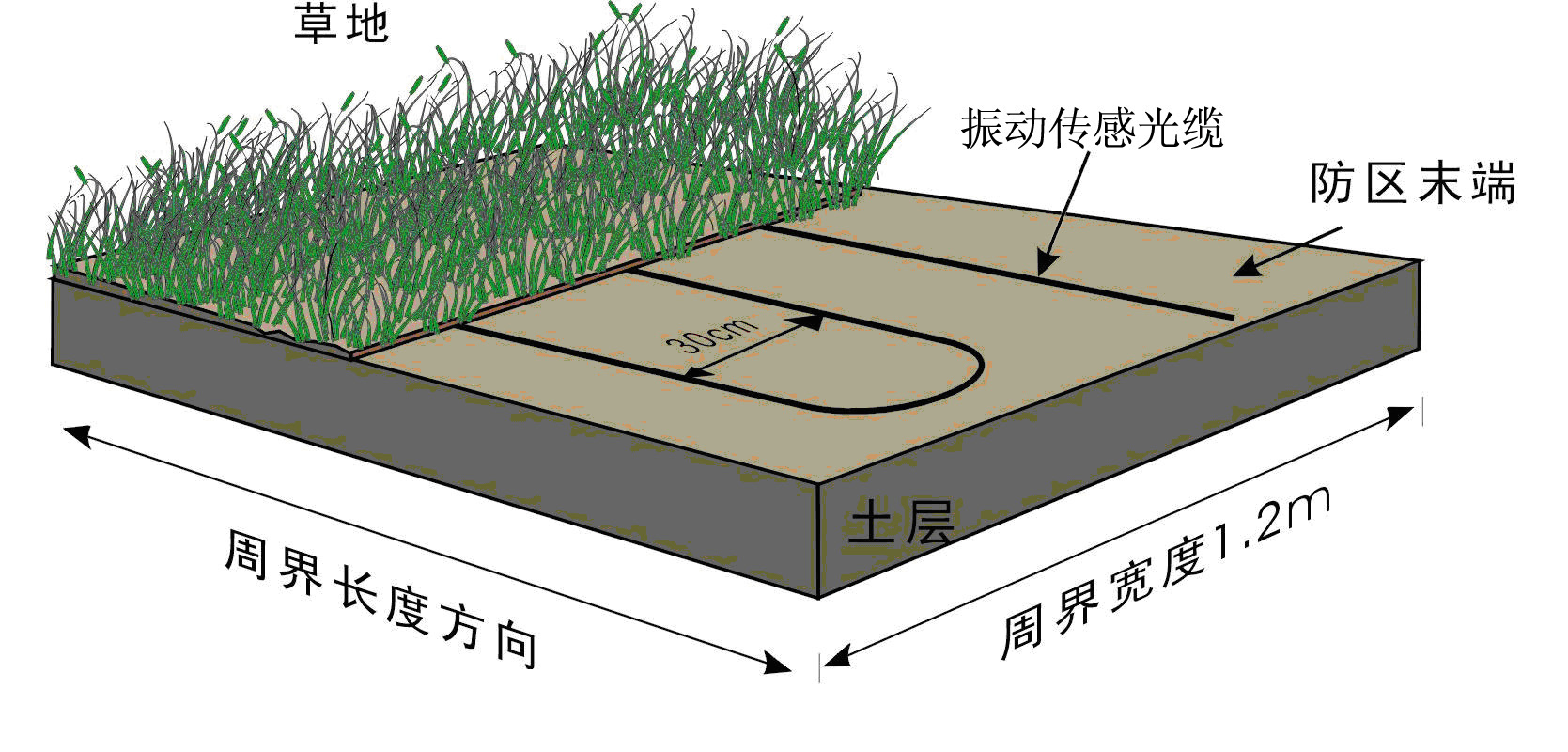 在沙土地下埋設(shè)振動(dòng)傳感光纜時(shí),也采用平行鋪設(shè)多道振動(dòng)傳感光纜的鋪設(shè)方式,但由于沙土比較松軟,當(dāng)入侵者進(jìn)入該區(qū)域時(shí),透過沙土層對(duì)振動(dòng)傳感光纜施加壓力,振動(dòng)傳感光纜可探測(cè)到微小的擠壓變形并產(chǎn)生信號(hào),所以在沙土地埋設(shè)振動(dòng)傳感光纜時(shí),應(yīng)減少平行振動(dòng)傳感光纜的間距,而且埋設(shè)不可過深。通常采用的間隔為20--25cm,埋設(shè)深度為5--10cm,如圖。在進(jìn)行施工時(shí),首先在需要鋪設(shè)光纜的區(qū)域挖出一道寬1.2m,深10cm的凹槽,在凹槽的底部平鋪一層厚度為3cm的粗沙,再將振動(dòng)傳感光纜平行鋪設(shè)于粗沙表面,每隔50cm用鋼絲線卡子固定。光纜鋪設(shè)完成后,在其上面覆蓋一層厚度為5cm的粗沙,最后在其表面均勻地覆蓋一層1--2cm的地表介質(zhì)(細(xì)沙或松散干燥的泥土)。